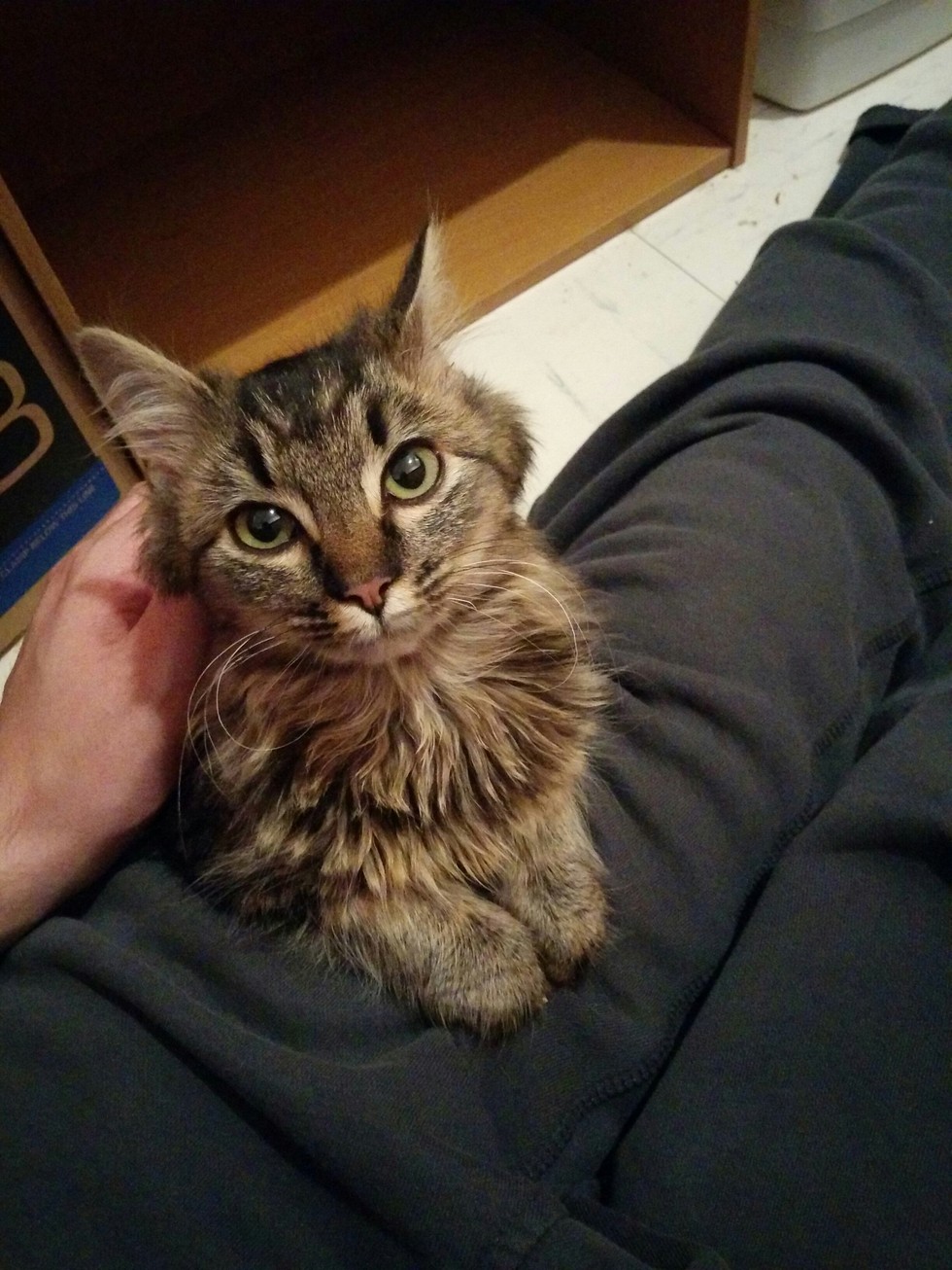 “A little later on she was a bit more curious, so I let her roam around. She appeared to not like heights, such as the couch, so I sat on the ground with her.”