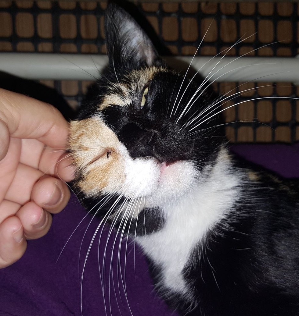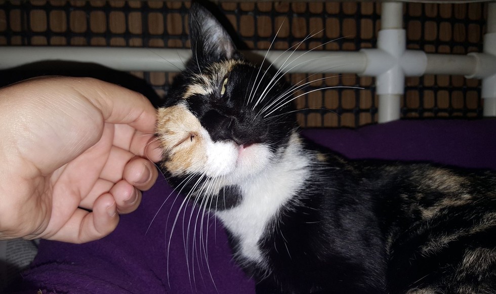 Holly purring at her caregiver, showing her love. “Even though someone did this to her, look at all the love she has to offer.”